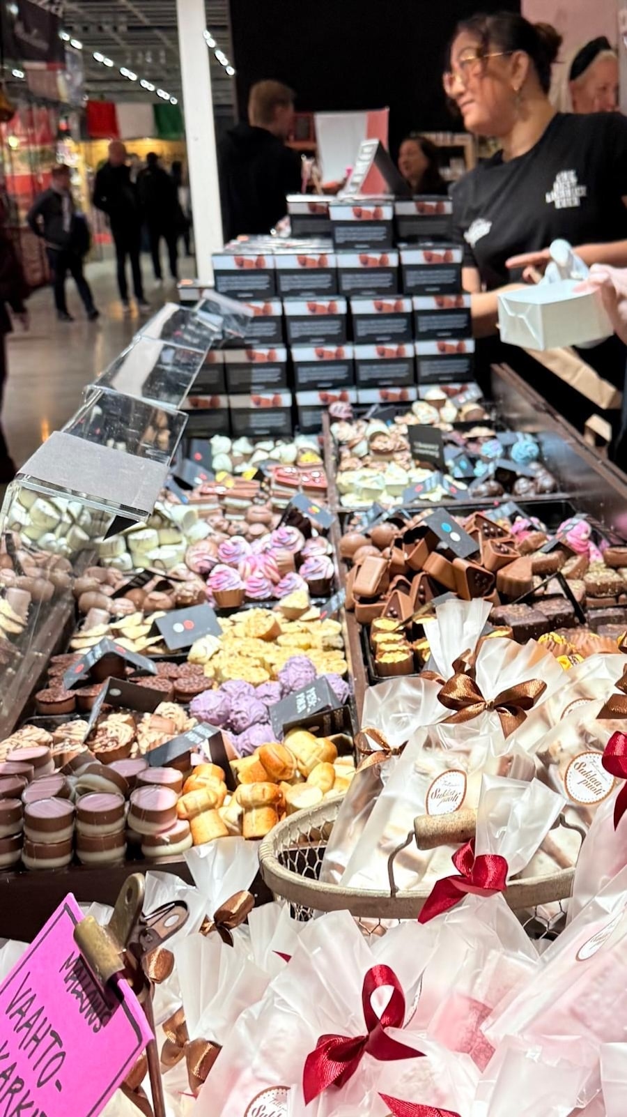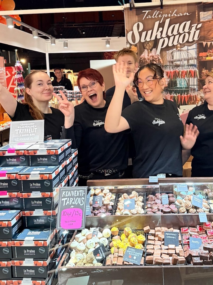 Meille suklaapuotilaisille syksy on kiireistä aikaa ainakin kahdesta syystä. Ensinnäkin kulisseissa käy jo kova tohina, kun tonttupaja valmistelee joulua ja kokoilee liikelahjatilauksia (jos muuten herkut kiinnostavat liikelahjoiksi, luepas sivumme aiheesta). Toiseksi syksyisin Tallipihan Suklaapuodin herkut löytävät tiensä vuoden isoimmille messulle – VIINI JA RUOKA -TAPAHTUMAAN Helsingin messukeskukseen. Messupäivät ovat meille aina pienimuotoinen rutistus. Päivät ovat usein pitkiä ja kiireisiä, mutta onneksi hirmuisen hauskoja. On kiva tavata asiakkaita toisista kaupungeista ja kertoa Suklaapuodista sellaisille, jotka eivät ole paikasta tai koko Tallipihan alueesta koskaan kuulleet.