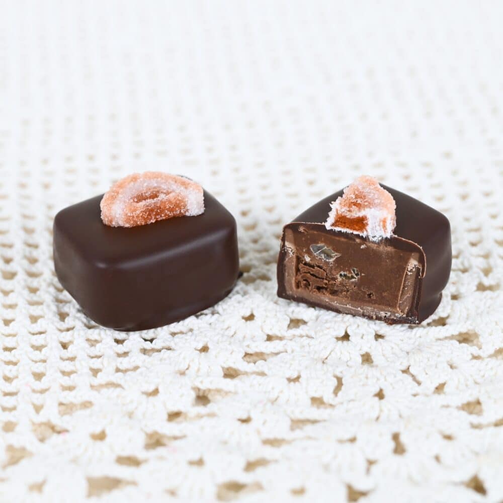Täyteläinen appelsiini tummasuklaakonvehti, jossa sisällä pähkinäinen täyte ja appelsiinimarmeladipaloja.
