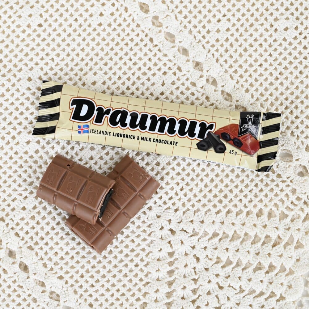 Ihana islantilainen maitosuklainen salmiakkilakritsipatukka! Tämä lakritsitäytteinen Draumur-suklaapatukka tuli valikoimaamme asiakkaan toiveesta joskus aikoja sitten, ja se on pysynyt suosiossa siitä lähtien. Tällä tuotteella on vannoutunut fanikunta sekä asiakkaiden kuin meidän suklaapuotilaisten keskuudessa.