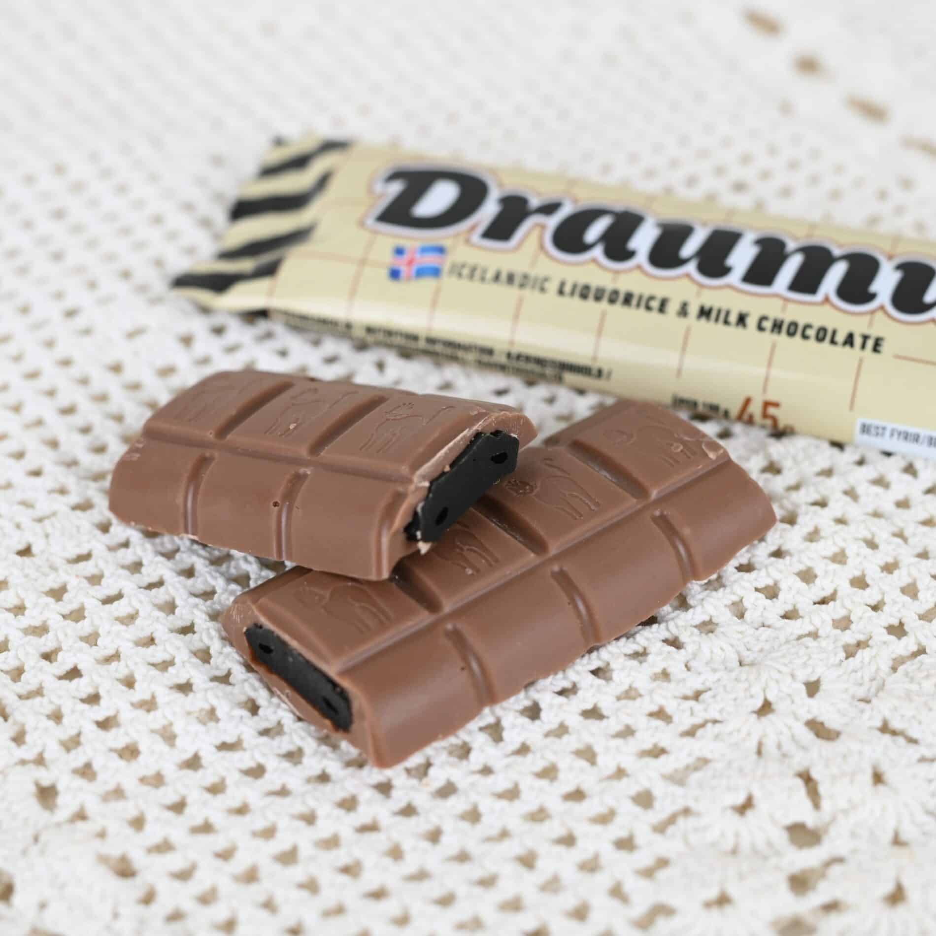 Draumur – islantilainen maitosuklaa-lakritsipatukka 45 g. Valmistaja Freya, Islanti.