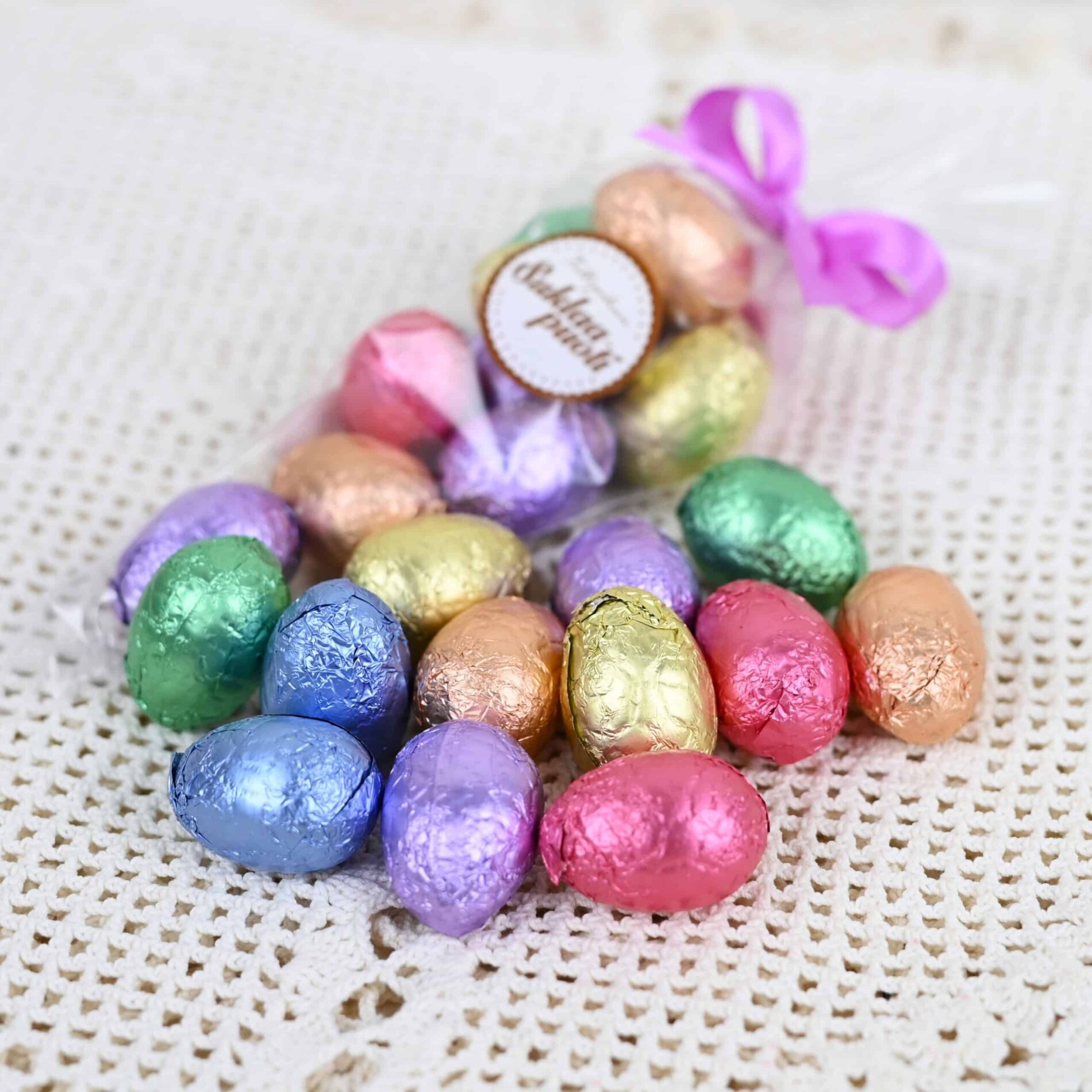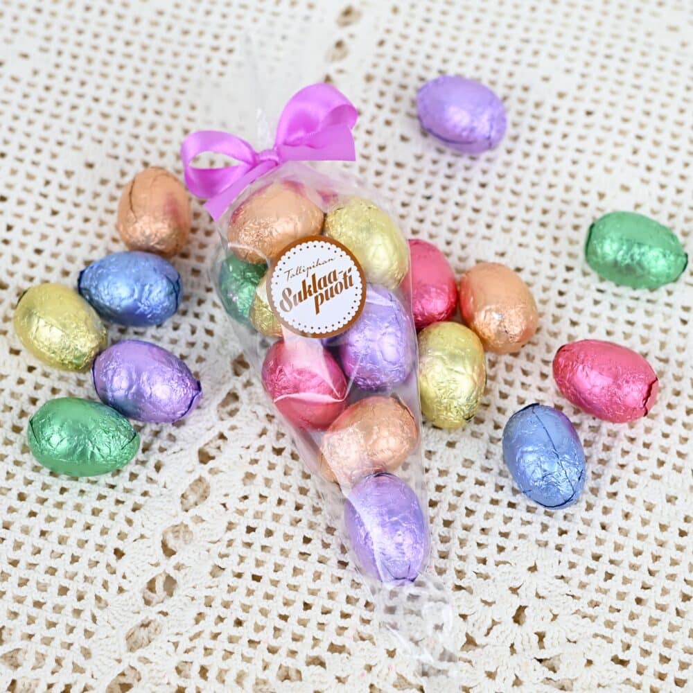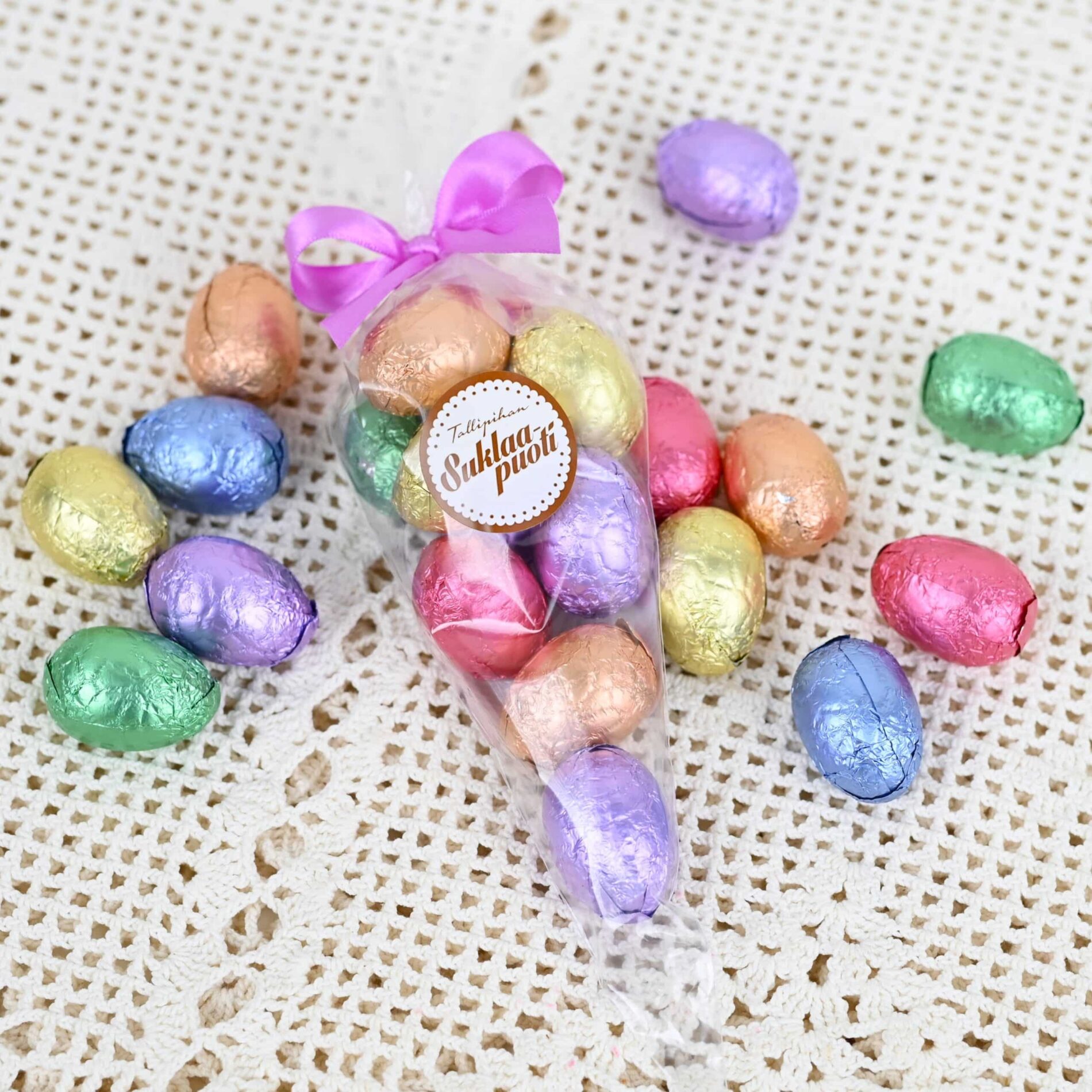 Söpöt kokosuklaiset ja hasselpähkinätäytteiset suklaamunat pussissa.