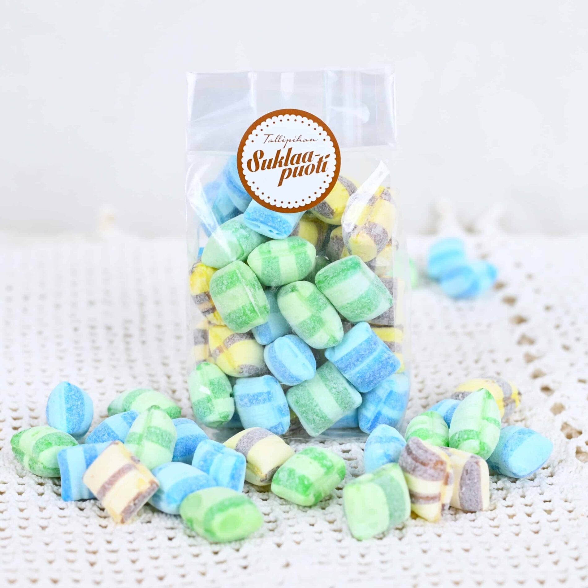 Hauskat värikkäät hedelmäkarkit sellofaanipussissa! Hedelmäkarkkityynymix on sekoitus kovia karkkeja, joiden maut ovat banaani, mustikka ja päärynä. Näissä makeisessa riittää makua!