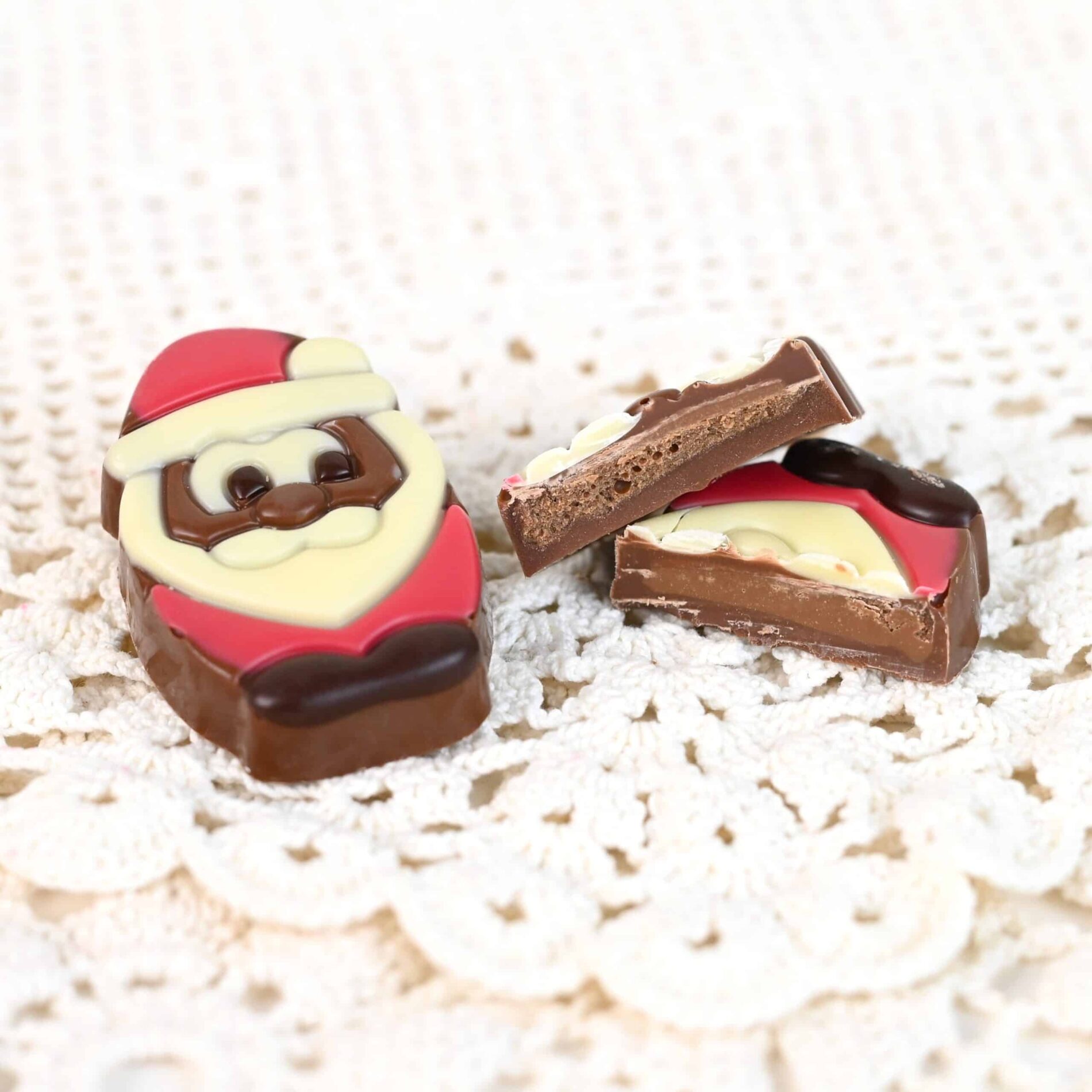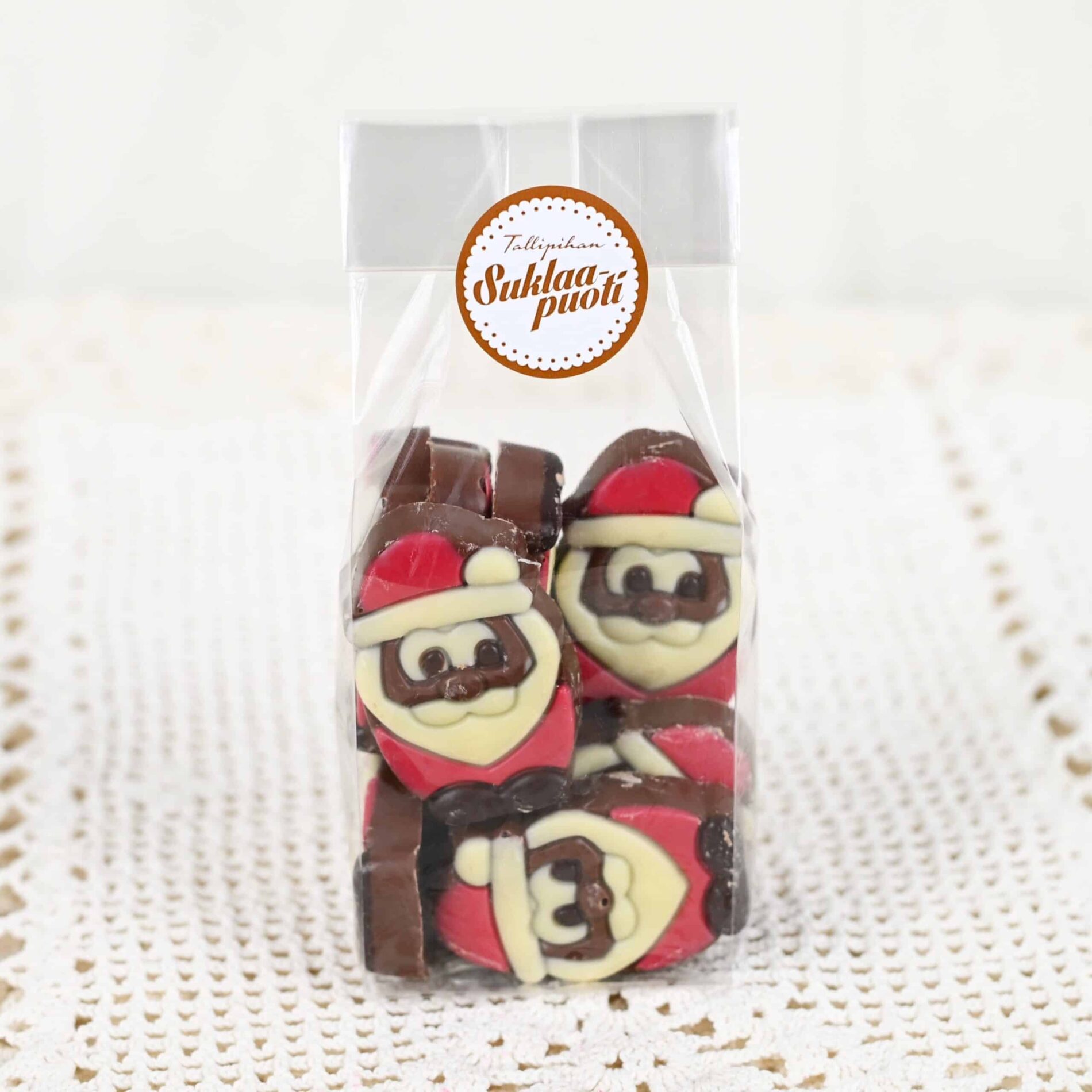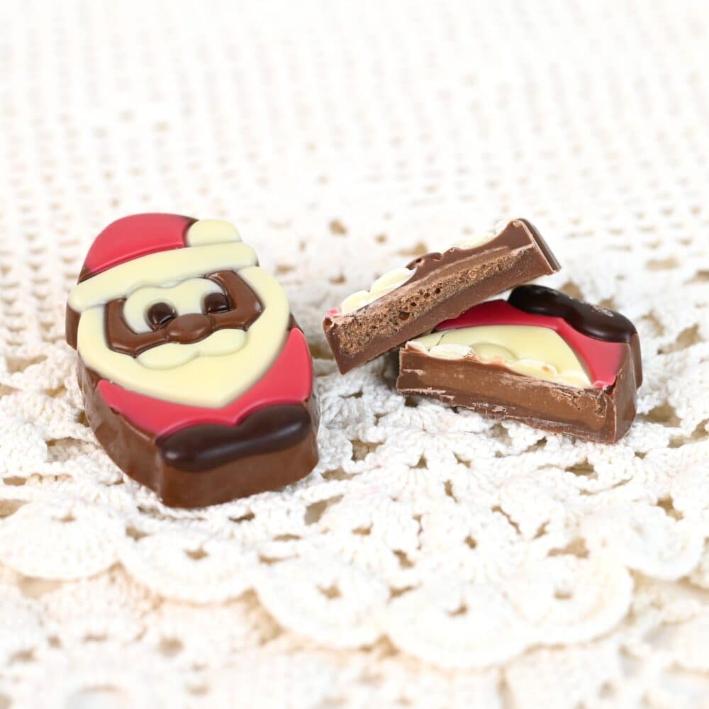 Tästä pukki kotiin! Litteä maitosuklainen veikeä joulupukki pitää sisällään pehmeän hasselpähkinäisen täytteen.
