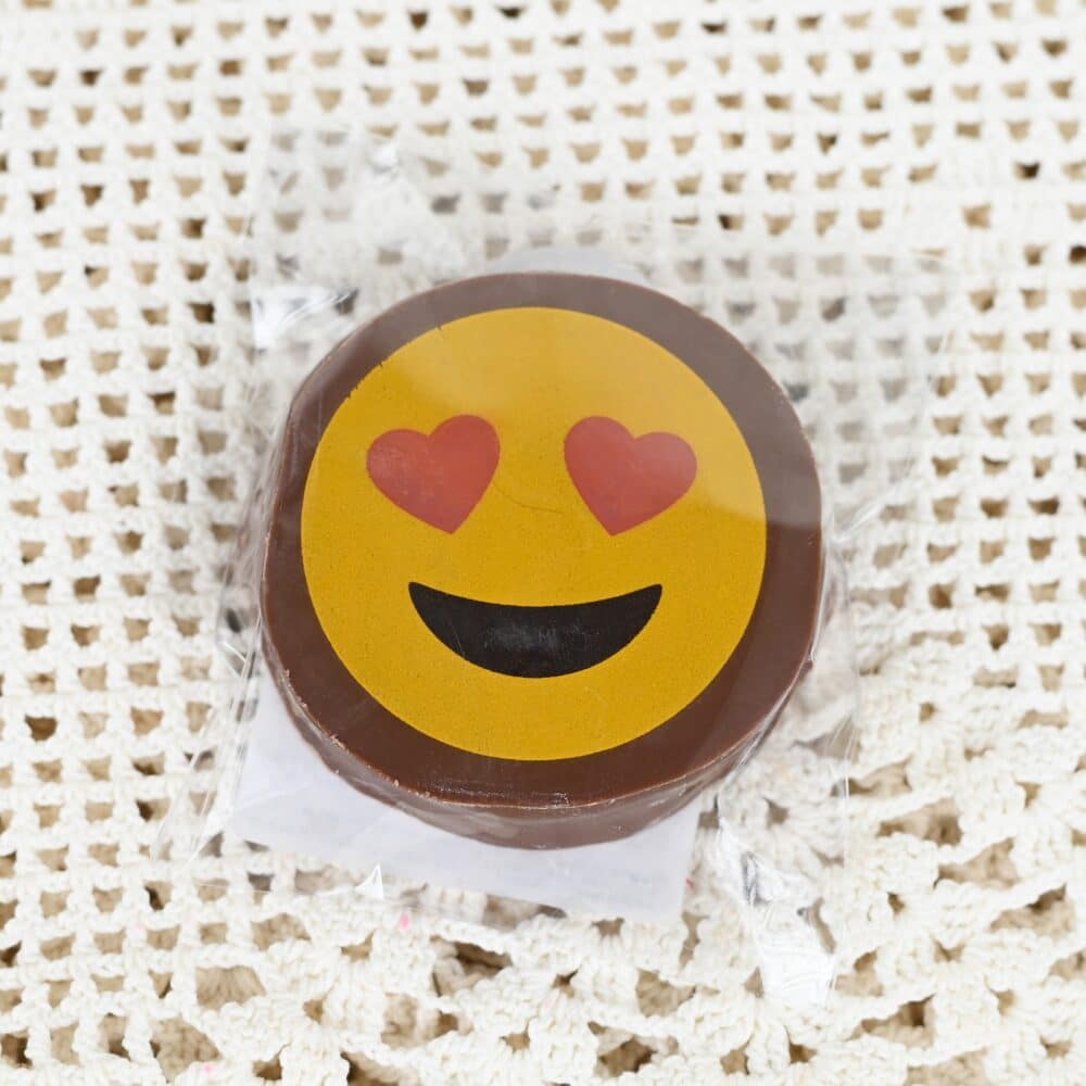 Ihastuttava maitosuklaapintainen vaniljavaahtokarkkiemoji. Emojin sisus on muhkeaa vaniljaista vaahtokarkkia ja päällinen hyvänmakuista maitosuklaata. Tämä on ihana lahjaidea ystävälle tai itselle!