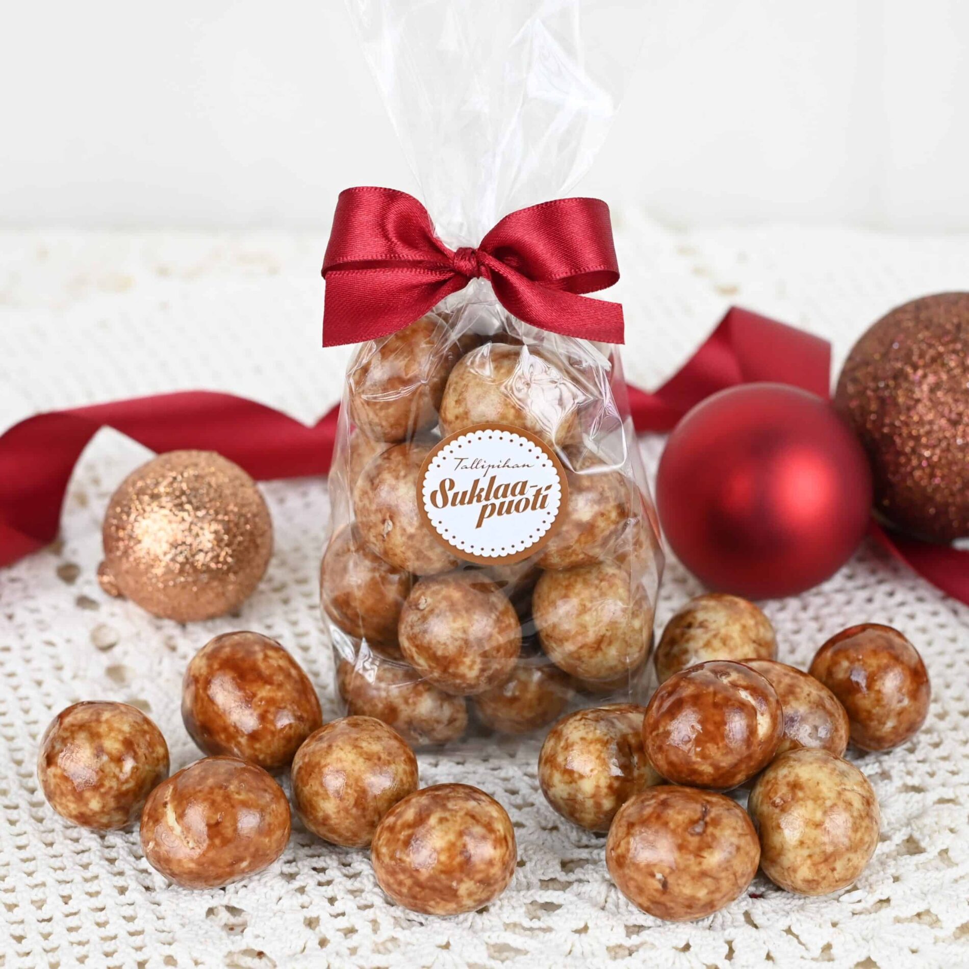 Suklaapäällysteiset nougat-vohvelikuulat Tallipihan Suklaapuodista. Rusetin väri saattaa vaihdella. Paino 160 g. Valmistettu Saksassa. Pakkaaja Tallipihan Suklaapuoti, Tampere.