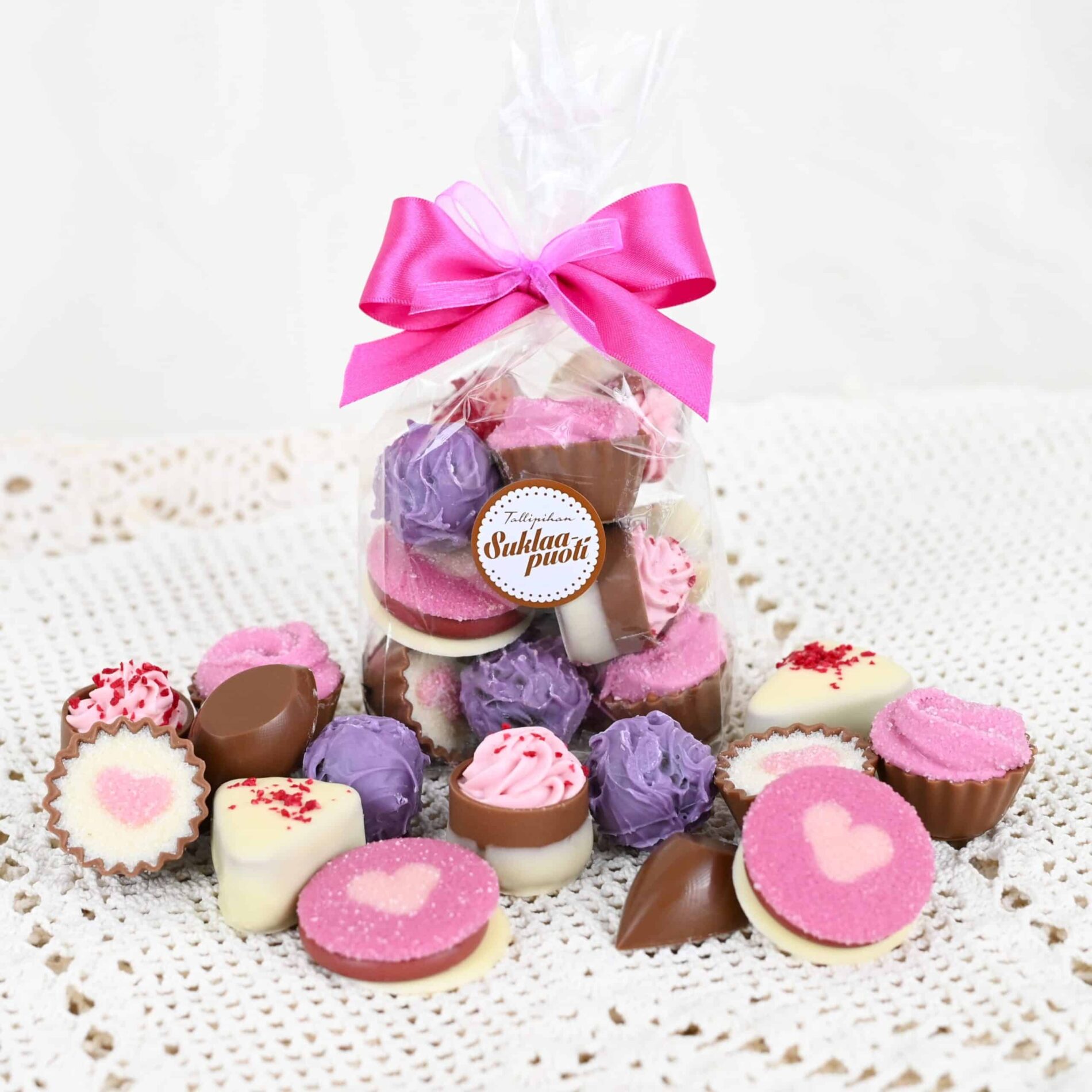 *Pussin sisältöön ei valitettavasti voi vaikuttaa. Ethän tilaa tätä tuotetta, jos haluat valita konvehdit itse. Huomioithan ennen tilaamista, että erittäin huolellisesta pakkaamisesta huolimatta konvehdit voivat vioittua jonkin verran kuljetuksen aikana. Tälle emme valitettavasti voi mitään, mutta haluamme kertoa tämän etukäteen, ettei tule pettymyksiä.*
