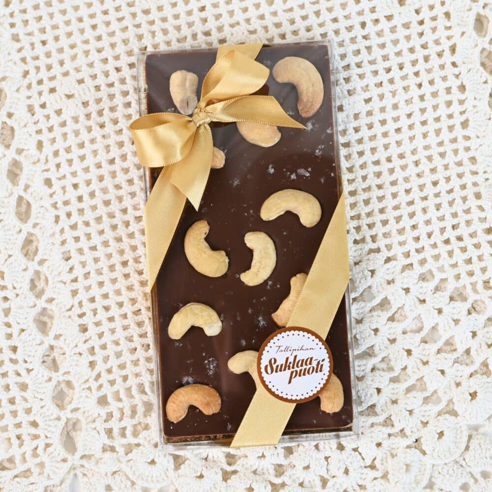 Pralinhuset cashewpähkinät & suola vegaaninen ”maito”suklaalevy. Levy on pakattu läpinäkyvään pakkaukseen ja koristeltu kauniilla rusetilla. Levyn paino 100 g. Valmistaja Pralinhuset Chokladtilverkning. Valmistettu Ruotsissa. Säilytys kuivassa ja viileässä.