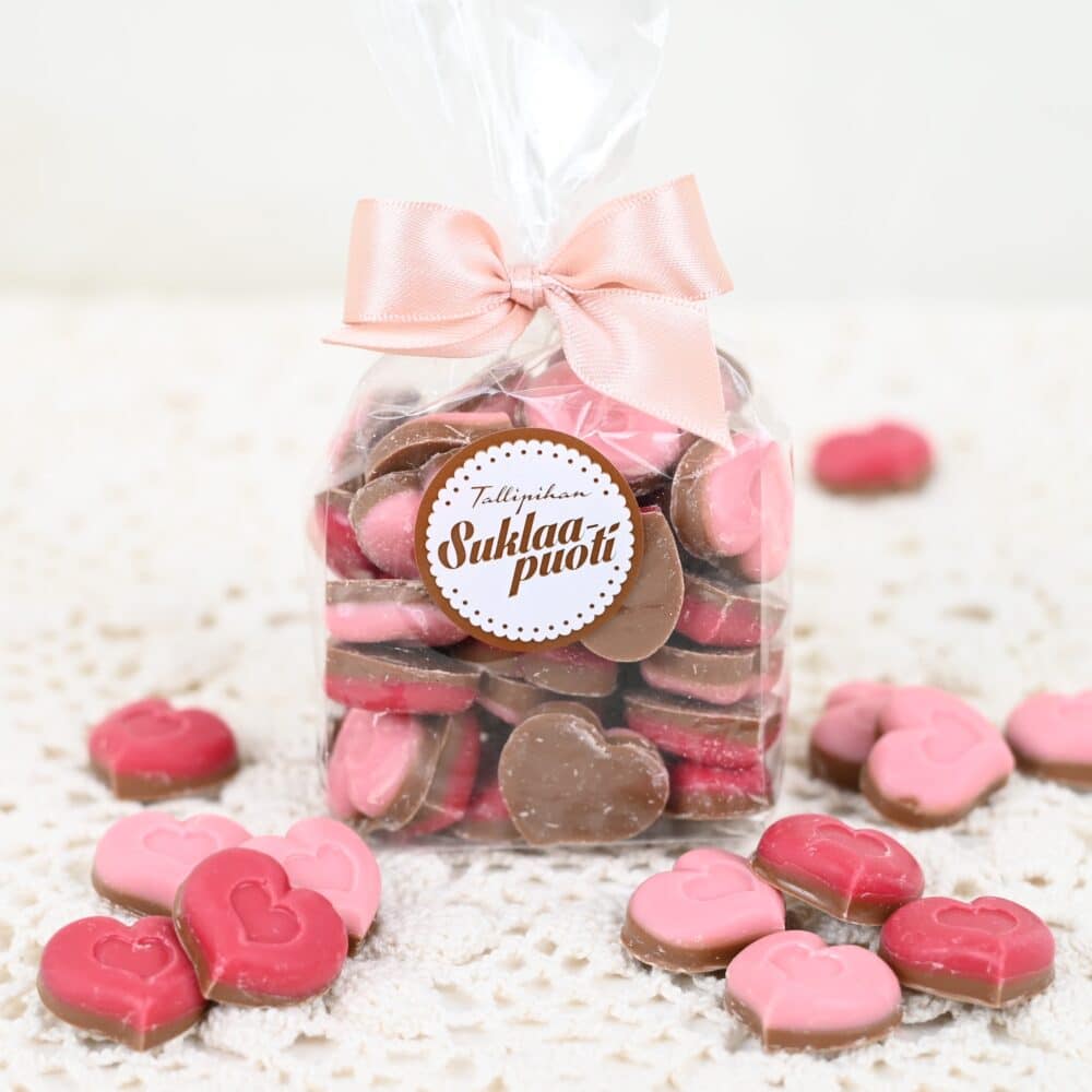 Nämä herkut vievät sydämen mennessään! Pienet valkosuklaiset ja maitosuklaiset suklaasydämet, jotka on pakattu pussiin söpöllä rusetilla. Loistava lahjaidea vaikkapa ystävänpäiväksi tai äitienpäiväksi. Sopii hienosti myös kakunkoristeeksi!