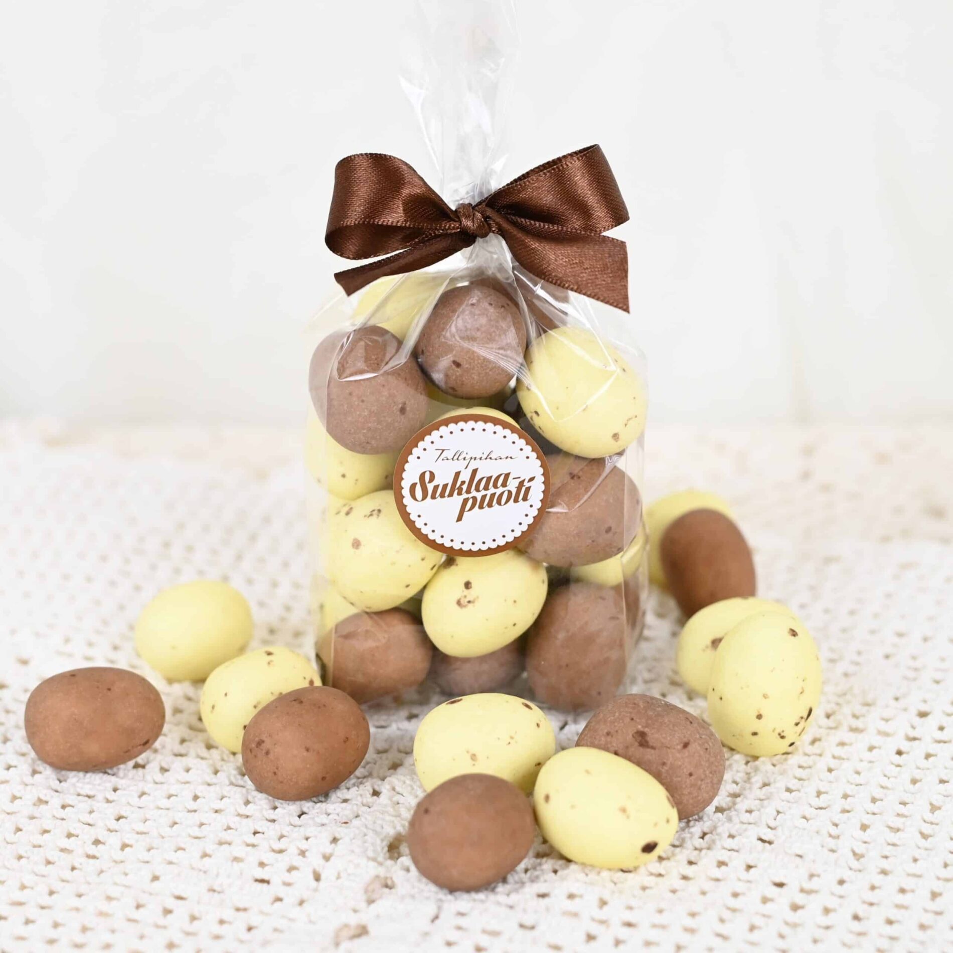 Muhkea pussillinen ihania sokeripäällysteisiä samppanjan ja cappuccinon makuisia suklaapalleroita aikuiseen makuun. Ohuen rapsakan kuoren sisällä ihana suklaanautinto. Tämä oli aluksi Suklaapuodilla vain pääsiäistuote, mutta suuren suosion vuoksi lisäsimme herkulliset Suklaiset Marc De Champagne- ja cappuccinopallerot vakituiseen valikoimaamme!