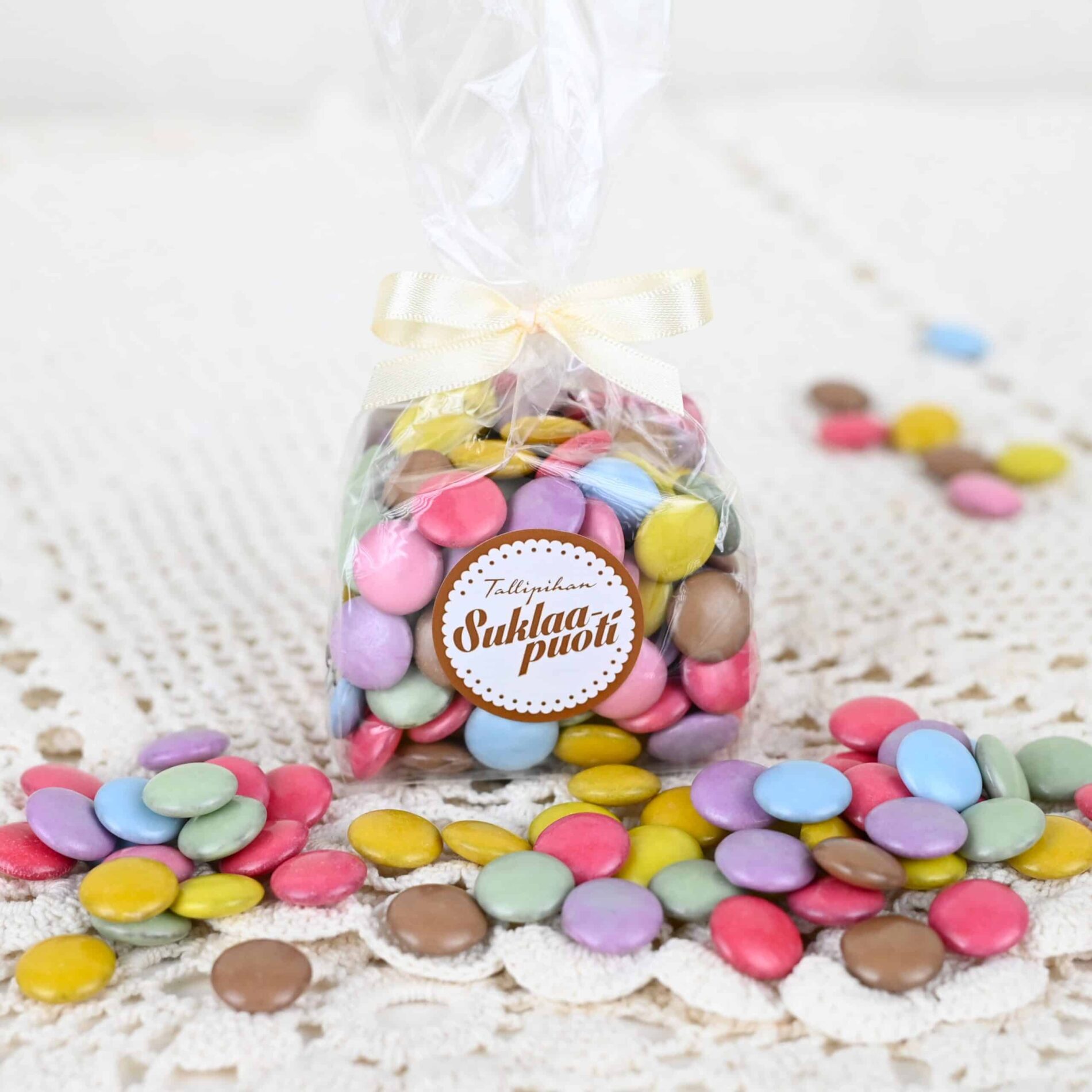 Tallipihan Suklaapuodista vegaaniset värikkäät suklaarakeet sellofaanipussissa. Pussissa 100 g. Valmistettu Saksassa. Pakkaaja Tallipihan Suklaapuoti.